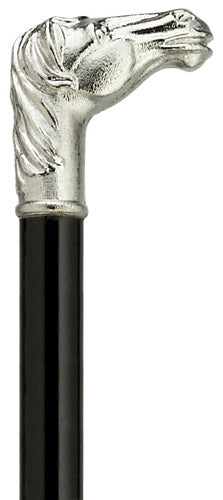 Ladies petite metallic finish plastic embossed silver tone horse head handle mounted stylishly on a hard wood shaft. The shaft is 36" long with black stain finish.
