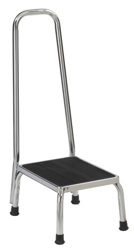 Safety step stool with handrail, all steel construction with a non-slip rubber pad step, 11" x 14" x 9" high.